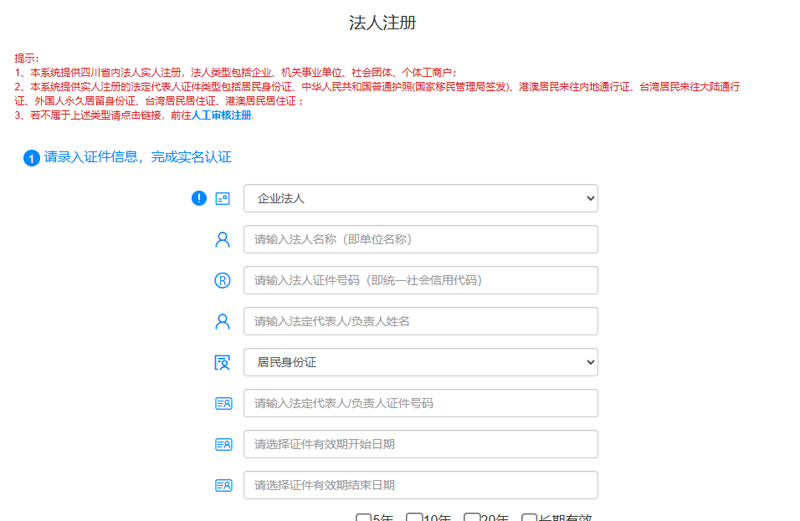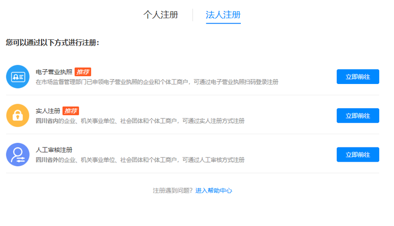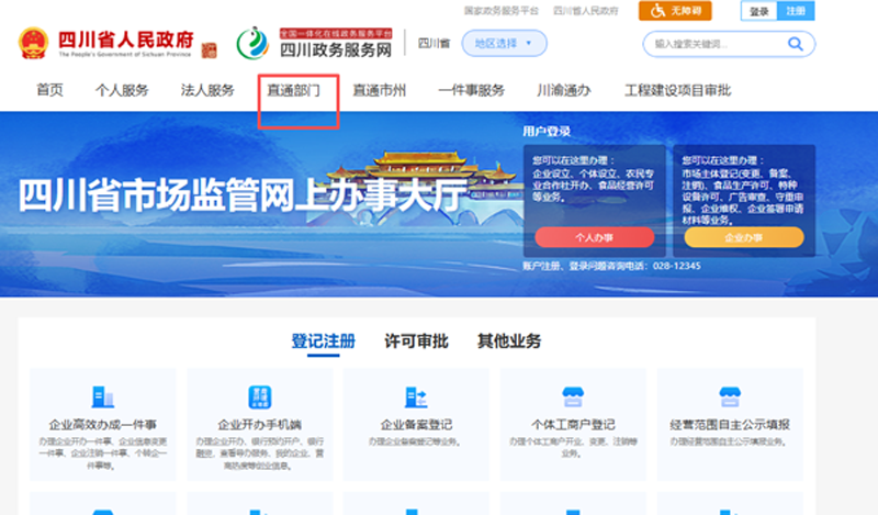 1、需使用法人账号(即公司账号)登录四川政务服务网完成备案,如未注册法人账号,请点击注册-法人注册。